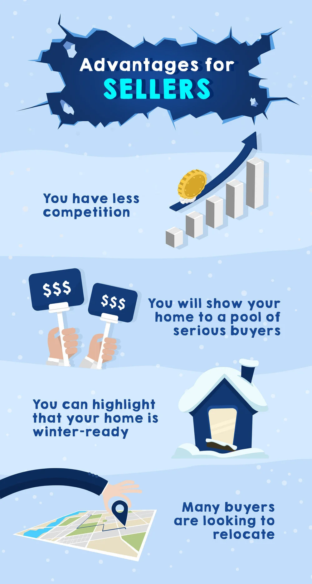 Since there are fewer homes on the market, you have less competition from other sellers. The low inventory creates increased competition among buyers, which generally result in higher sale prices. This is why winter can also be an ideal time to sell your home.